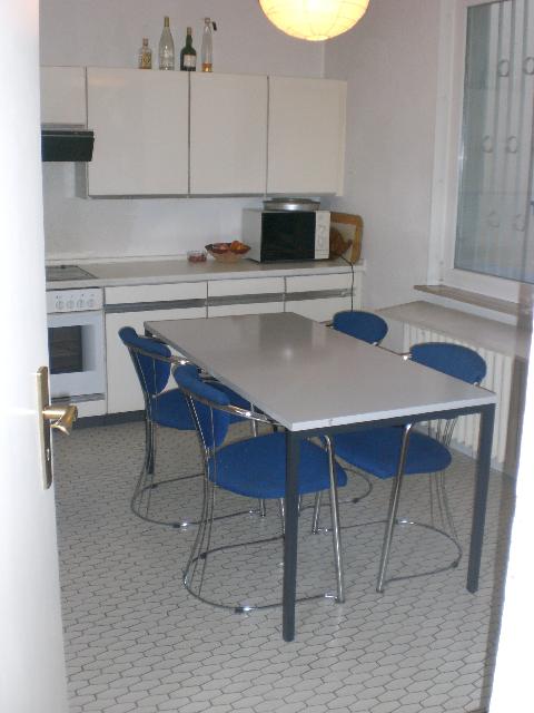 Eine große Küche mit Fenster, E-Herd und Backofen, Waschmaschiene und Wäschetrockner stehen auch allen Mitbewohnern zur Verfügung. Ein Abstellraum geht von der Küche ab.